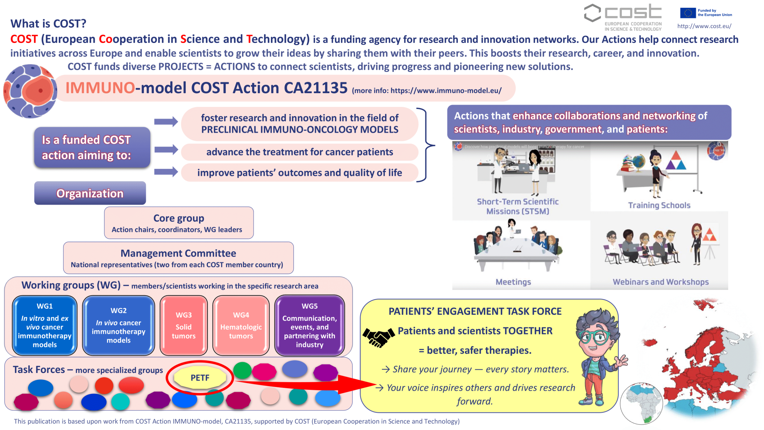 The Patient Engagement Task Force of the COST Action IMMUNO-model, led by Leticia Oliveira-Ferrer, brings together scientists, healthcare providers, patients and representatives of cancer patient organisations to improve patient involvement in immunotherapy research and implementation.